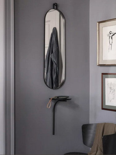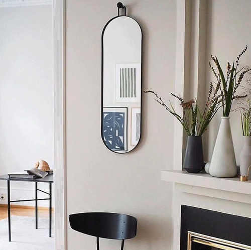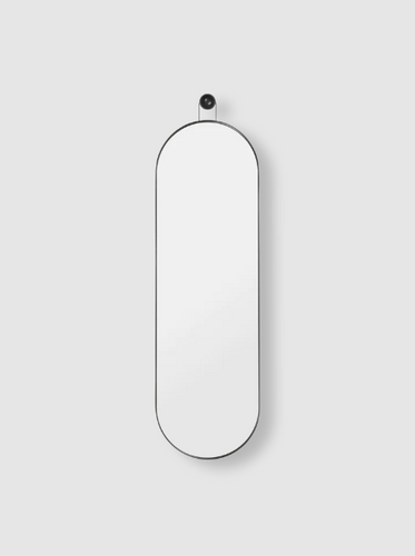 The elegant lines and simple shape meet in a beautiful oval mirror with a black powder-coated metal frame. Its oblong form explores the dimensions of the circle and draws a straight line to our unique geometric design language. The included black wooden peg complements the strict silhouette with a natural finishing touch.Wipe with a soft damp cloth or gently clean with soft sponge and mild detergent.