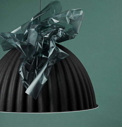 Materials: Shade is made in up to 60% recycled plastic fibers. Cord made in rubber. A large sheet of PET material is heated in a mould and pressed into its shape.