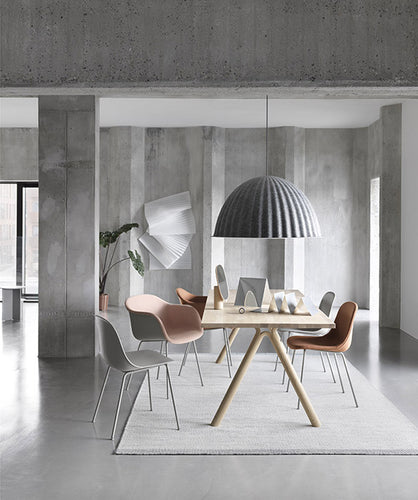 The lamp embraces and shelters the table and people beneath it – both physically and in a more abstract sense. The material absorbs sounds and helps to improve the acoustics of the room, making Under the Bell a perfect luminaire above the dining table and in other spaces where people gather to talk together.